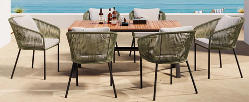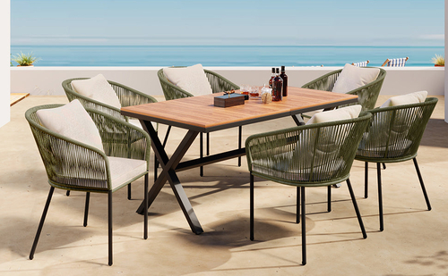 Introducing our meticulously crafted outdoor dining set, comprising a rectangular table and six chairs designed to elevate your dining experience. Crafted with a robust iron frame and acacia wood tabletop, the table exudes durability and sophistication. The ergonomic chairs boast a curved backrest for optimal comfort and support, complemented by plush seat cushions and back pillows for a luxurious seating experience. Equipped with adjustable feet, both the chairs and table ensure stability on any outdoor terrain, making them perfect for backyard barbecues or serene garden picnics. With its eye-catching green rope weaving, this set adds a contemporary flair to any outdoor space, seamlessly blending style and functionality for any setting.