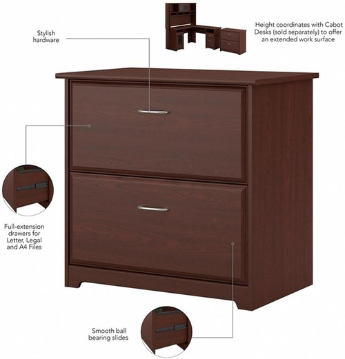 - STORAGE MADE STYLISH: Elevate your office decor with Bush Furniture’s Cabot Lateral Filing Cabinet. This cabinet has two spacious drawers that comfortably hold letter, legal and A4 size files while displaying a rich and timeless appearance.
