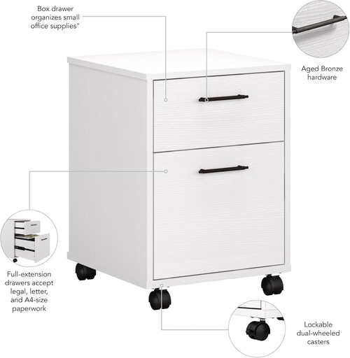 The Key West 2 Drawer Mobile File Cabinet presents an ideal home office storage solution for those who embrace coastal and farmhouse styling. Take advantage of the lower file drawer to organize letter-size documents while using the box drawer to stash small office supplies and everyday essentials. The rolling file cabinet’s low-profile design, easy maneuverability, and casual styling make it a great addition to virtually any home office or living space. Choose from several attractive finish options to find the perfect look for your space and upgrade your home office with an array of coordinating Key West products, including office chairs, computer desks, accent cabinets, bookcases, and more (sold separately). Based in Jamestown, N.Y., Bush Furniture has been a leading manufacturer of ready-to-assemble furniture for over 60 years. We pride ourselves on being your trusted one-stop shop for high-quality home furnishings at an exceptional value. Our growing collection of unique designs allow you to outfit your living space with safe, stylish solutions that fit every room and any budget.