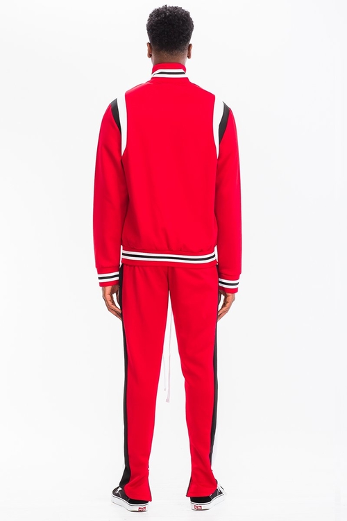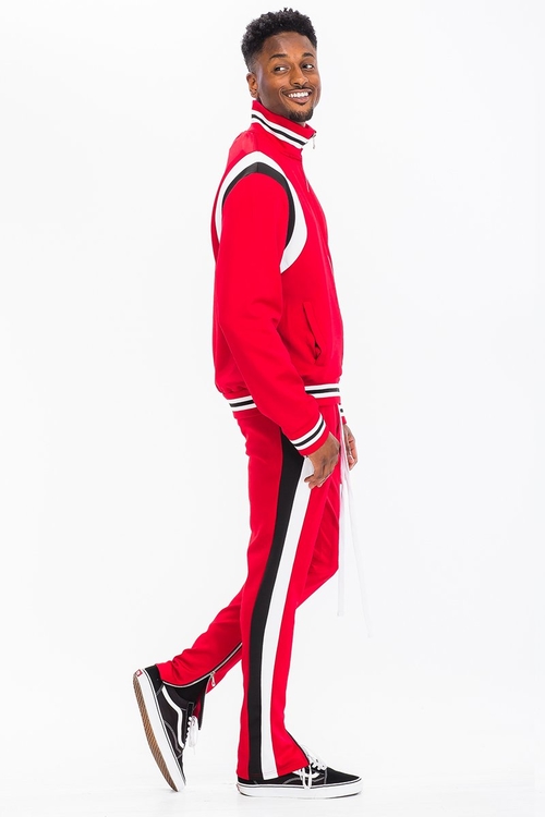 This full track jacket and pant track set is quality to the tee. Dual chevron stripe along the arm and shoulder rim and down the side of bottoms. Standout collar and cuffs with the same dual stripe detail. Full zip track jacket with elastic waist and drawstring track pants.