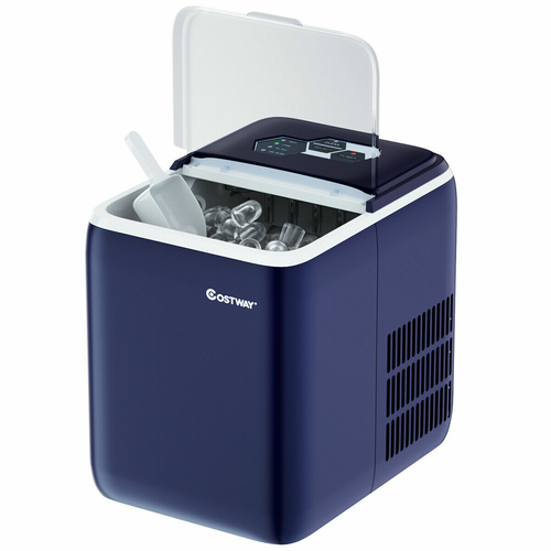 Always have enough ice cubes for a cold beverage with this incredible ice maker machine. Â Featuring a 2.6L water reservoir, this ice maker machine fast produces 12 cubes of bullet-shaped ice (2 sizes for choose) per 8.5 minutes, up to 20 kg of daily ice yields, and stores the ice for 2.1L temporarily. You will be given an ice scoop to access ice in a hygienic way. The water shortage and excessive ice situations can be detected and the ice-making procedure can be observed through the easy-view lid. Moreover, this machine is able to be self-cleaned for daily cleaning. Â With a compact size, this ice making machine is a keeper on your kitchen counter, RV, office bar and so on. Â Simple operation indicators and buttons Self-cleaning for a user-friendly experience Safer with water shortage and ice tip alarm Made of rigid ABS and PP materials for durability Extra benefit: an ice scoop included for fast transport ices healthily Makes ice of a bullet shape with 2 optional sizes, harmless to your mouth Boasts 2.6 L water tank, yields 12 cubes of ice per 8.5 minutes, 20 kg per day Compact and take up a little countertop area, for home and commercial use Able to keep and store 2.1L cubes with the R600a refrigerant and removable ice basket Specifications: Colour: Navy Main material: ABS, PP Overall dimension: 27 x 37 x 33cm (Lx W x H) Net weight: 10kg Refrigerant: R600a Productivity: 20kg / 24h Ice-making cycle: 8.5-9.5 minutes Ice storage capacity: 2 L Water tank capacity: 2.6 L Voltage: 220-240V / 50Hz Package includes: 1 x Ice maker 1 x Ice scoop 1 x Removable basket 1 x Instruction