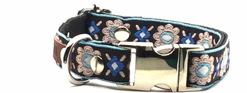 Durable Designer Hand Made Dog Collars which are practical and stylish for the Dog on the Go. This Pattern was designed for a Smaller Dog Breed and has a width length of 15mm. The Metal Hardware is also 15mm. This Pattern can be made to fit larger dogs, but please be aware that the Strength of the Hardware increases with its large size. Some Clients prefer having a thinner collar on their dogs, and only use the Collar for Style, or to hold their Dog Tags.