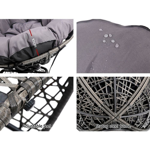 Our papasan chair is made of UV-resistant PE wicker and features wicker weaving around a durable steel frame. It is 360 ° rotatable and the cushion covers are also non-fading and removable for easy cleaning. It has a weight capacity of 150kg.