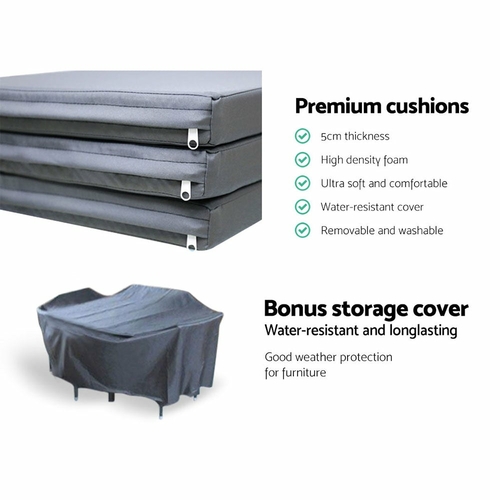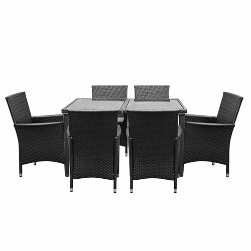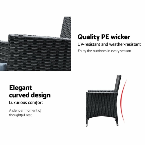 Dine in exquisite style with our elegant Gardeon Outdoor Dining Set. Finished in UV-resistant PE rattan with a strong and sturdy aluminium frame construction for both chairs and table, this multi-piece dining set is designed to please as well as stand up to the weather elements. The chairs have a sleek and contoured profile with 5cm thick high density foam cushions to ensure comfort and style are always in place. And the spacious dining table features a 5mm thick tempered glass top for safe and hardy use. Not least, a water-resistant cover for the entire ensemble is also included to keep it clean always.