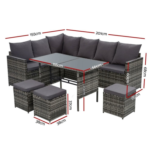 Invite your friends and family over for a garden party or just sit back and relax with our Gardeon Outdoor Sofa Dining Set. Being a 9-seater, the dining set provides enough room for all your guests to sit or for you to have a lie down and enjoy a book. You can arrange the seats in various ways depending on your needs and there are hooks included to secure the seats firmly together. The sofa is made of sturdy powder-coated steel frame with quality PE wicker finish that not only looks stylish but is perfect for outdoor use as it is both UV-resistant and weatherproof. The cushions and pillows on the sofa provide ultimate comfort and are waterproof as well. The set also includes a matching table that has a 5mm tempered glass top with buffers for added protection. Choose from four stylish models to suit your requirements.