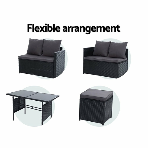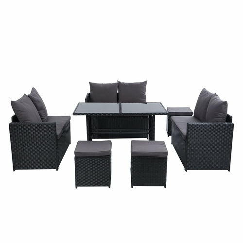 Invite your friends and family over for a garden party or just sit back and relax with our Gardeon Outdoor Sofa Dining Set. Being a 9-seater, the dining set provides enough room for all your guests to sit or for you to have a lie down and enjoy a book. You can arrange the seats in various ways depending on your needs and there are hooks included to secure the seats firmly together. The sofa is made of sturdy powder-coated steel frame with quality PE wicker finish that not only looks stylish but is perfect for outdoor use as it is both UV-resistant and weather-resistant. The cushions and pillows on the sofa provide ultimate comfort and are water-resistant as well. The set also includes a matching table that has a 5mm tempered glass top with buffers for added protection. Choose from four stylish models to suit your requirements.