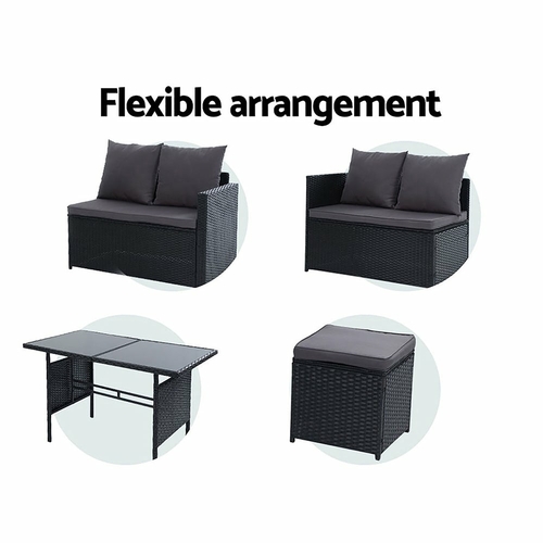 Invite your friends and family over for a garden party or just sit back and relax with our Gardeon Outdoor Sofa Dining Set. Being a 9-seater, the dining set provides enough room for all your guests to sit or for you to have a lie down and enjoy a book. You can arrange the seats in various ways depending on your needs and there are hooks included to secure the seats firmly together. The sofa is made of sturdy powder-coated steel frame with quality PE wicker finish that not only looks stylish but is perfect for outdoor use as it is both UV-resistant and weather-resistant. The cushions and pillows on the sofa provide ultimate comfort and are water-resistant as well. The set also includes a matching table that has a 5mm tempered glass top with buffers for added protection. There is also an optional storage cover for you to protect the set from sun and rain when not in use, so that you can keep enjoying your garden parties for many years to come. Choose from four stylish models to suit your requirements.