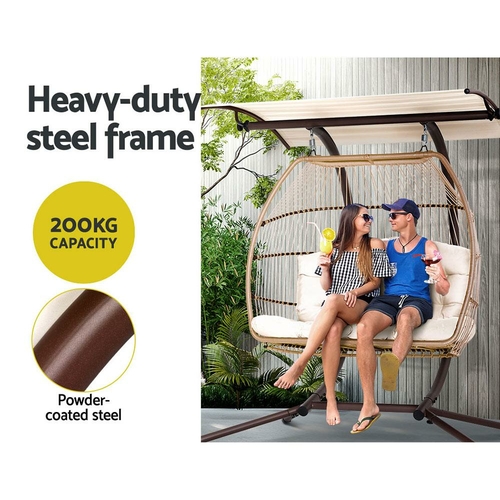 Otherwise known as the hanging egg chair, our Gardeon Double Hanging Pod Chair is the epitome of ultimate relaxation with a cool and exotic vibe. With its 100% hand-woven UV-resistant resin wicker, the pod chair is beautifully handcrafted and well hung on a steel pole for stability and strength. Plus, the adjustable canopy can be angled to suit your shading or completely removed for a wondrous tan. The powder-coated steel frame finish ensures that corrosion will never be an issue while the soft, fully-padded cushioned seat offers plush comfort for daydreamers and leisure seekers alike. Best of all, it seats two and has ample space for relaxation with a weight capacity of up to 200kg. Sit back with your loved one and turn an ordinary day into an extraordinary one. Hang cool people!