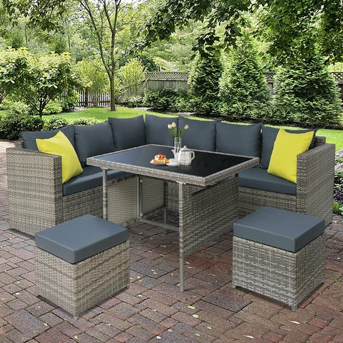 Invite your friends and family over for a garden party or just sit back and relax with our luxurious Gardeon Outdoor Sofa Dining Set. Being a multi-seater, the dining set provides enough room for all your guests to sit or for you to have a lie down and enjoy a book. You can arrange the seats (double seat, corner seat and ottoman) in various ways depending on your needs. The sofa is made of sturdy powder-coated steel frame with quality PE wicker finish that not only looks stylish but is perfect for outdoor use as it is both UV-resistant and weather-resistant. The seat cushions are 8cm thick to provide ultimate comfort and are water-resistant as well. The set also includes a matching table that has a 5mm thick tempered glass top with buffers for added protection.