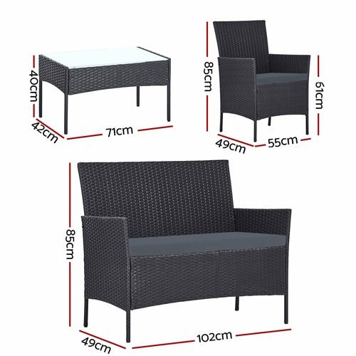 Meticulously crafted, our Gardeon 4-piece Wicker Outdoor Set comprises a chic loveseat, two single armchairs and one matching side table for a beautiful integrated look. Its presence will definitely add panache and style to your deck, patio or even living room. Made of eco-friendly PE wicker and a sturdy steel frame, this set is designed to last through all weather and the test of time. The 5mm tempered glass top for the side table also ensures a strong and safe use with total peace of mind. Not least, the cushion covers are removable and washable to maintain their pristine appearance.
