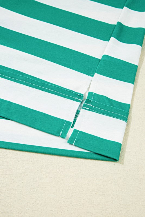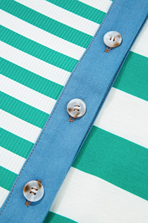 Green Stripe Color Collar Half Buttons T Shirt Top