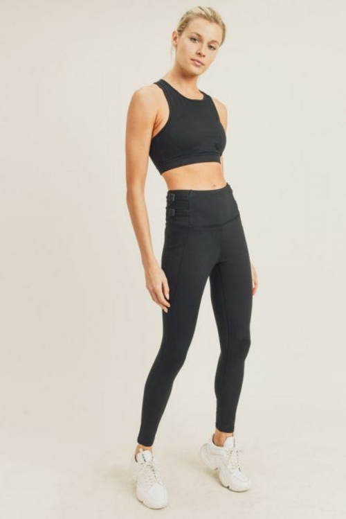 One subtle accent can elevate the feel and vibe of a pair of essential leggings. With two adjustable straps on each side of the high waistband, these leggings are unique and fierce.