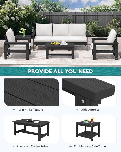 Elevate your outdoor living experience with the SERWALL 7-piece patio sectional set. This combination of a 3-seater sofa, two single-seat chairs, a coffee table, and a double-layer side table creates a cozy and stylish seating area perfect for relaxation and entertainment. Enjoy outdoor living with unmatched comfort and durability.