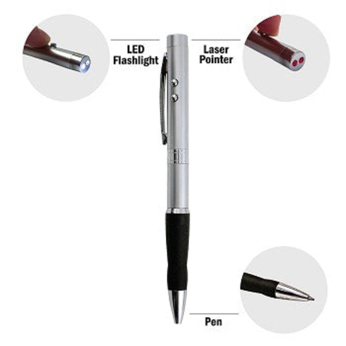 - Integrated Red Laser Pointer, LED Flashlight & Black Ink Pen