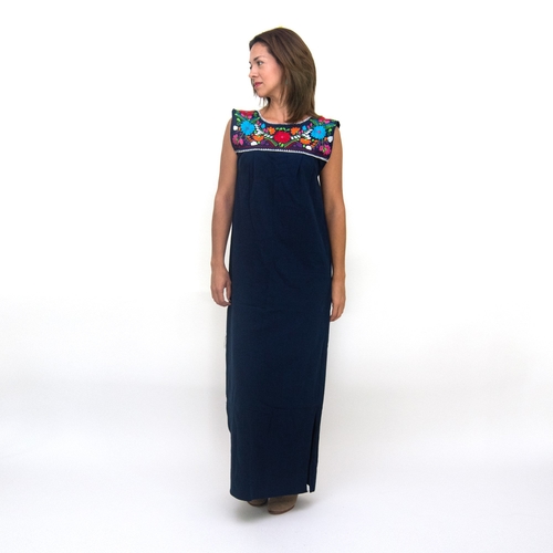Fashion Mexican long dress, hand embroidered with multi-colored flowers in navy blue cotton fabric.