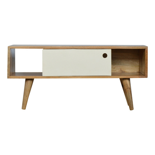 Media Unit with White Painted Sliding Door. This media unit has been constructed from 100% solid mango in an oak-ish finish. It stands on 4 Nordic-style legs making it sturdy. Some other features include an open slot with 1 sliding door Hand-painted in white and a round cut-out. It can look great alone or be partnered with the other hand-painted pieces from the range.