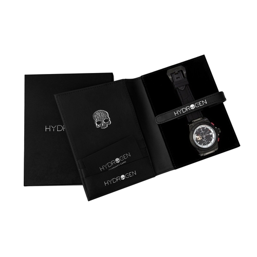 This Otto Chrono model represents authentic bold “luxury sports wristwear” in a blacked-out version within the series. Featuring a solid stainless steel case and bezel plated in ionic black with a black carbon fiber dial.  The strap features a faux croc pattern design on the black silicone strap.