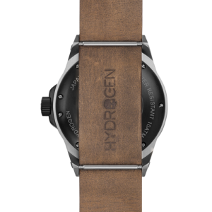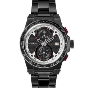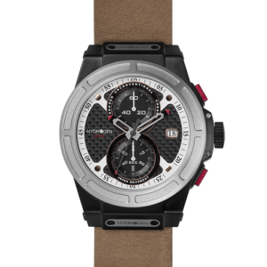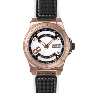 One of the most unique styles within the Otto Chrono series, the HW514410 offers a tri-tone coloration that is both bold and refined. This style features a rose gold solid steel case base with a yellow gold stamped bezel and black carbon fiber dial with an enlarged metallic gold iconic Hydrogen skull is at the 9-hour position. The strap is fabricated in a sport enhanced black silicone material with a faux croc-stamped pattern.