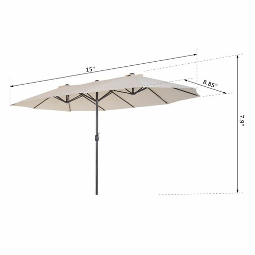 - TWIN UMBRELLA: This 15 foot long patio umbrella provides added protection with its extra-large double-sided design featuring an 8.85 foot diameter. Add complete shade to any park, garden, patio, backyard, beach, pool and outdoor setting. (STAND NOT INCLUDED)