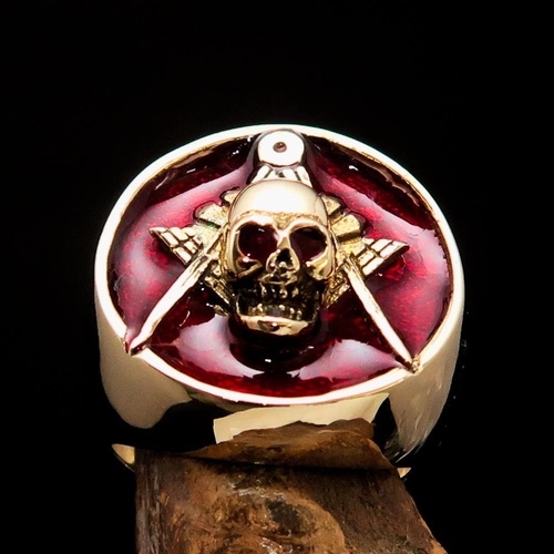 Solid Brass Men’s Masonic Skull Ring. High polished with red Enamel.