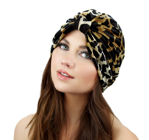 A gorgeous stretch velvet covers the top of the head in this full turban. Cinched at back for comfort and a perfect fit.