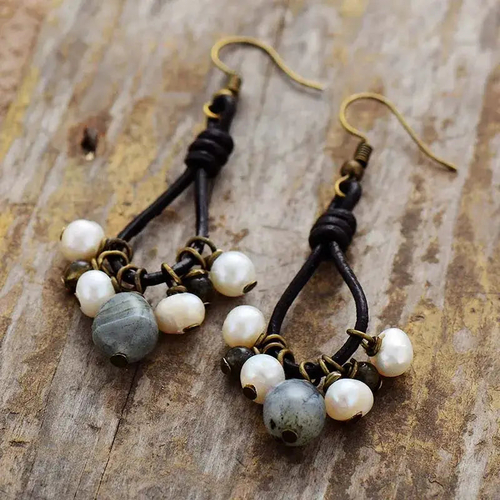 Vintage Pearl Labradorite Earrings. These Vintage Pearl Labradorite Earrings are handmade from high-quality water pearls and labradorite stones. The beautiful labradorite stones have been carefully selected for their unique iridescent glow, making each pair one-of-a-kind. With these earrings, you’ll feel confident and stylish, no matter the occasion.