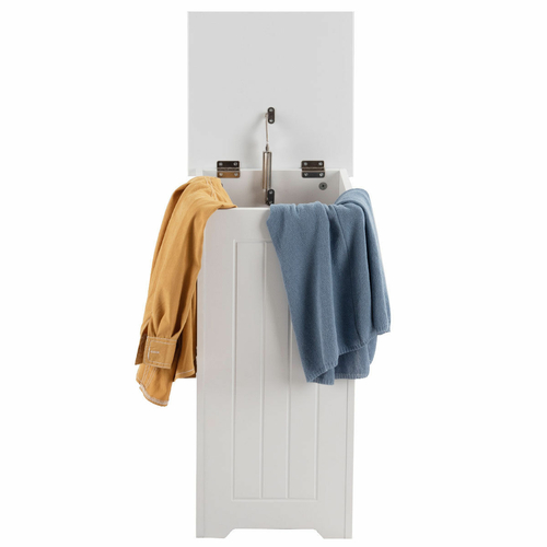 Modern white laundry bin ideal for a bedroom or bathroom   This large laundry bin is indispensable in your bedroom or bathroom. Featuring an elegant white finish, this wooden laundry bin will blend in with your traditional or modern decor.   Simple assembly required following instructions provided. Brand new and high quality. Enhancing the look of your house. Heavy-duty painted wood Freestanding for easier storage. Ideal for storing items in an organised manner Two side slot handles convenient for moving Large capacity, smart space-saving storage solution for your essentials. An elegant classic design which blends in with the traditional or modern decor. Specifications: Material: Wood Colour: White Size: 27 x 27 x 61cm ( L*W*H ) height 87cm with lid open G.W.: Approx. 7.6 kg N.W.: Approx. 6.8 kg Package includes:  1 x Laundry bin 1 x Instruction manual